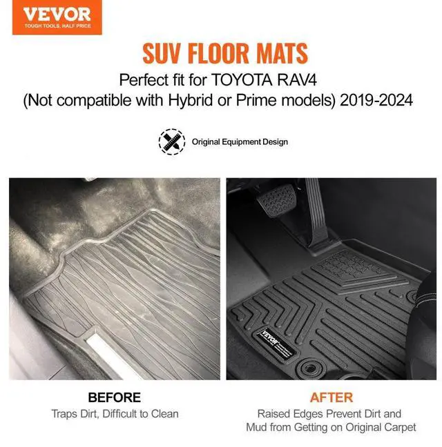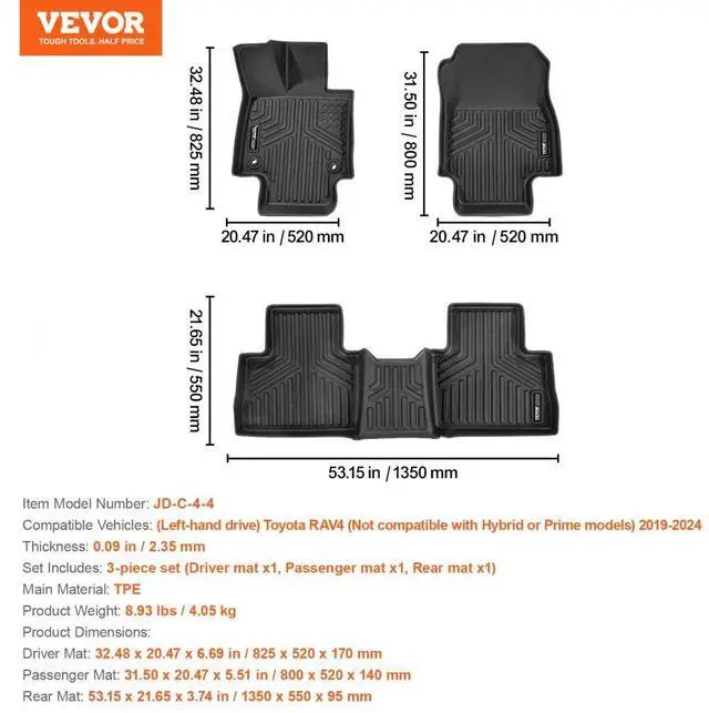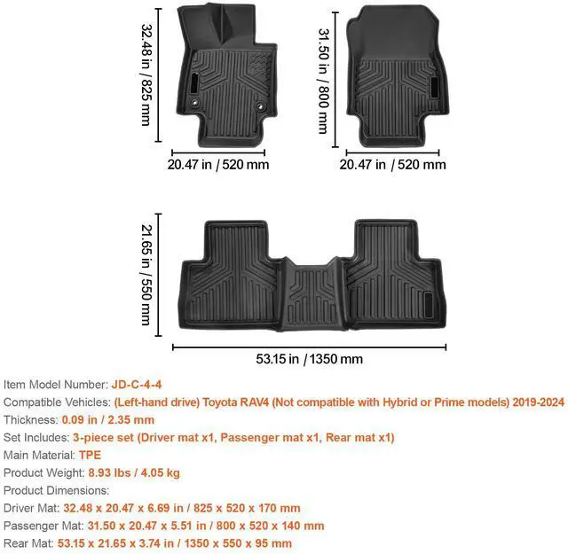 Thickness: 0.09 in / 2.35 mm,Item Model Number: JD-C-4-4,Product Weight: 8.93 lbs / 4.05 kg,Compatible Vehicles: (Left-hand drive) Toyota RAV4 (Not compatible with Hybrid or Prime models) 2019-2024,Set Includes: 3-piece set (Driver mat x1, Passenger mat x1, Rear mat x1),Main Material: TPE