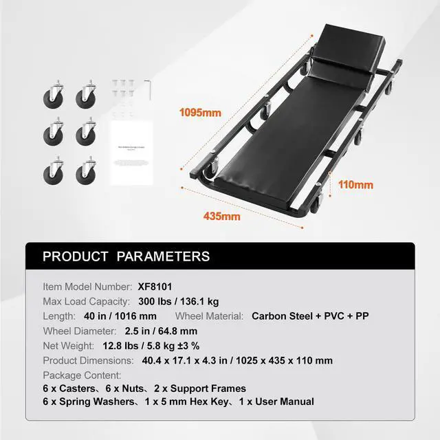 Length: 40 in / 1016 mm,Item Model Number: XF8101,Max Load Capacity: 300 lbs / 136.1 kg,Wheel Diameter: 2.5 in / 64.8 mm,Product Dimensions: 40.4 x 17.1 x 4.3 in / 1025 x 435 x 110 mm,Net Weight: 12.8 lbs / 5.8 kg ±3 %,Wheel Material: Carbon Steel + PVC + PP
