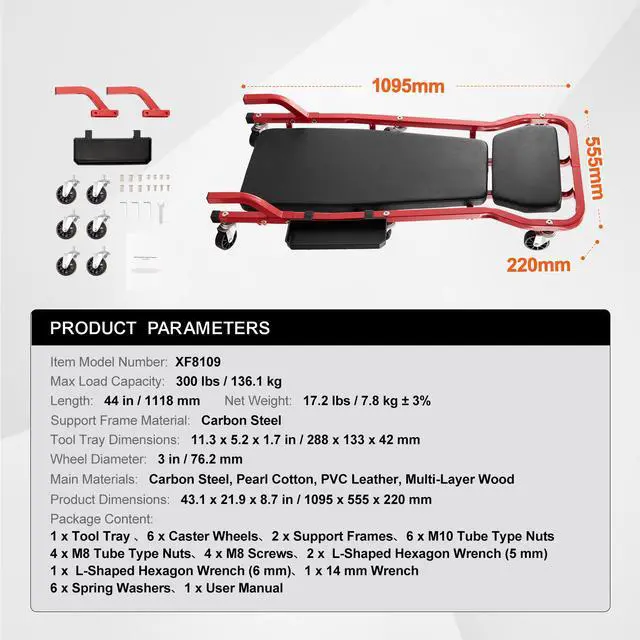 Support Frame Material: Carbon Steel,Main Materials: Carbon Steel, Pearl Cotton, PVC Leather, Multi-Layer Wood,Length: 44 in / 1118 mm,Tool Tray Dimensions: 11.3 x 5.2 x 1.7 in / 288 x 133 x 42 mm,Item Model Number: XF8109,Max Load Capacity: 300 lbs / 136.1 kg,Wheel Diameter: 3 in / 76.2 mm,Product Dimensions: 43.1 x 21.9 x 8.7 in / 1095 x 555 x 220 mm,Net Weight: 17.2 lbs / 7.8 kg ± 3%