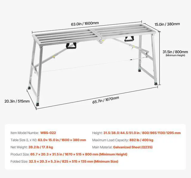 Item Model Number: WBS-022,Maximum Load Capacity: 882 lbs/400 kg,Folded Size: 32.5 x 20.3 x 5.3 in/825 x 515 x 135 mm (Minimum Size),Height: 31.5/38.0/44.5/51.0 in/800/965/1130/1295 mm,Table Size (L x W): 63.0 x 15.0 in/600 x 380 mm,Net Weight: 39.2 lbs/17.8 kg,Main Material: Galvanized Sheet (Q235),Product Size: 65.7 x 20.3 x 31.5 in/1670 x 515 x 800 mm (Minimum Height)