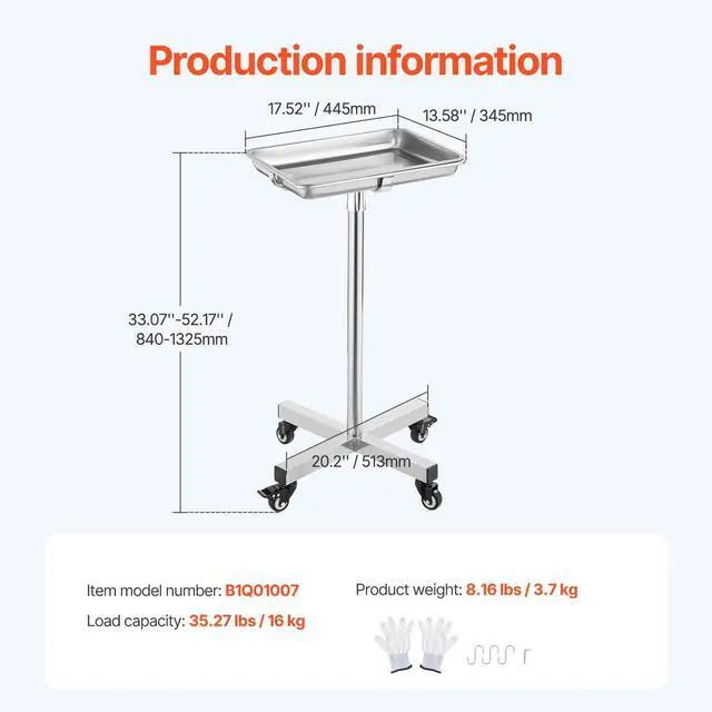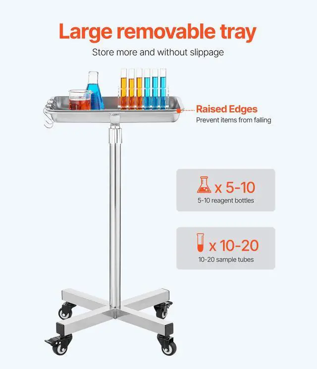 Mobile Mayo Stand Stainless Steel Mayo Tray 25.2"-39.8" with Removable Tray