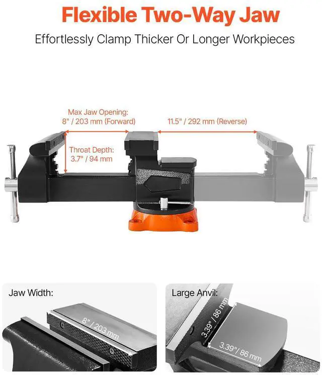 Max Jaw Opening: 8" / 203 mm (Forward); 11.5" / 292 mm (Reverse)