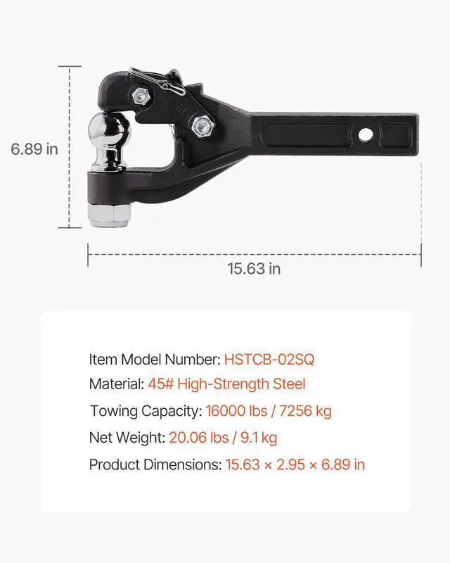 Item Model Number: HSTCB-02SQ,Towing Capacity: 16000 lbs / 7256 kg,Material: Carbon Steel 45#,Product Dimensions: 15.63 x 2.95 x 6.89 in / 397 x 75 x 175 mm,Net Weight: 20.06 lbs / 9.1 kg (including all accessories)