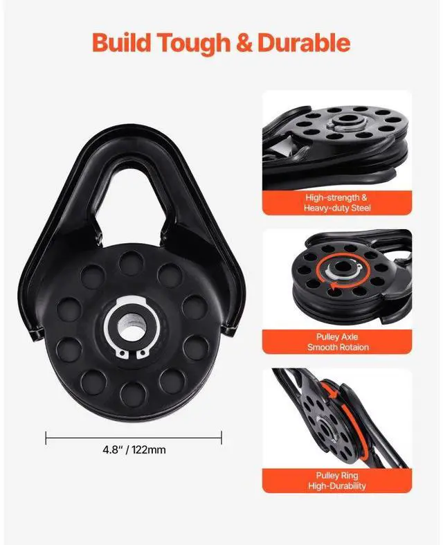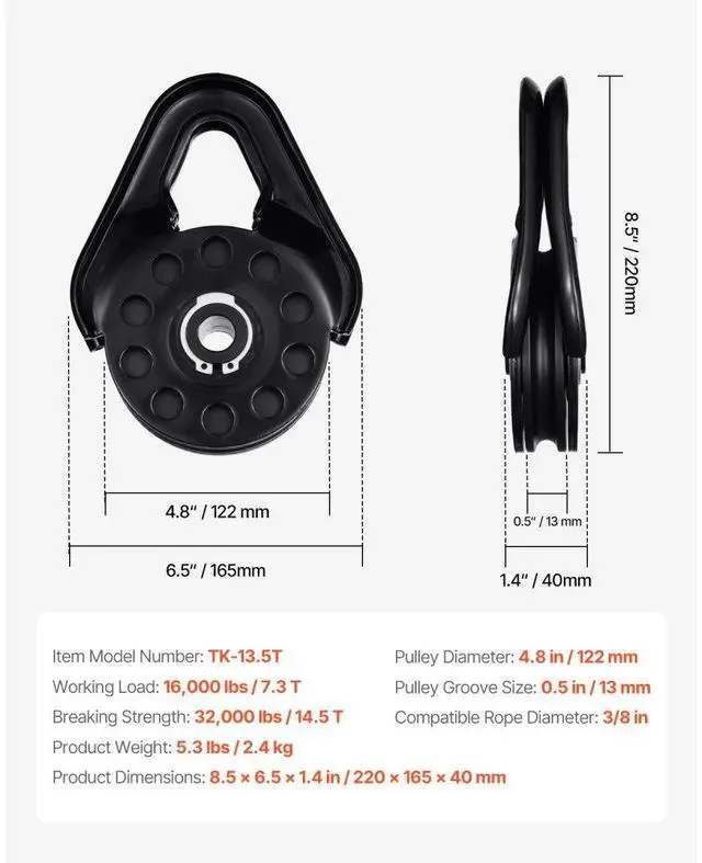 Breaking Strength: 32,000 lbs / 14.5 T,Item Model Number: TK-13.5T,Product Weight: 5.3 lbs / 2.4 kg,Pulley Groove Size: 0.5 in / 13 mm,Compatible Rope Diameter: 3/8 in,Product Dimensions: 8.5 x 6.5 x 1.4 in / 220 x 165 x 40 mm,Pulley Diameter: 4.8 in / 122 mm,Working Load: 16,000 lbs / 7.3 T