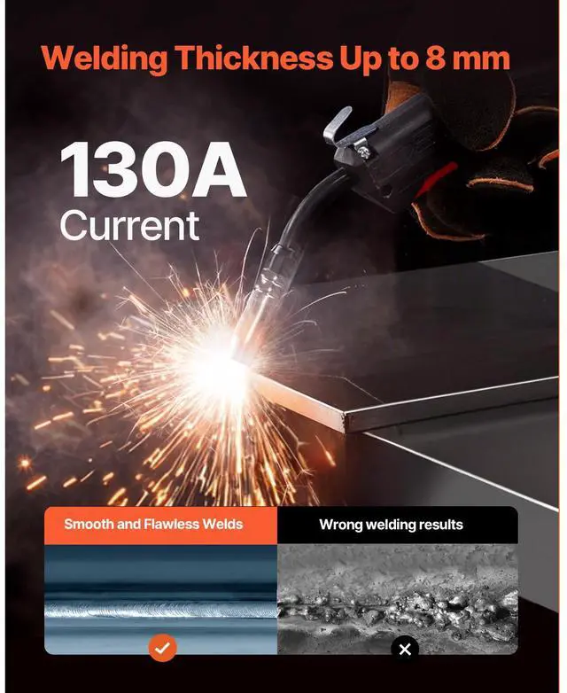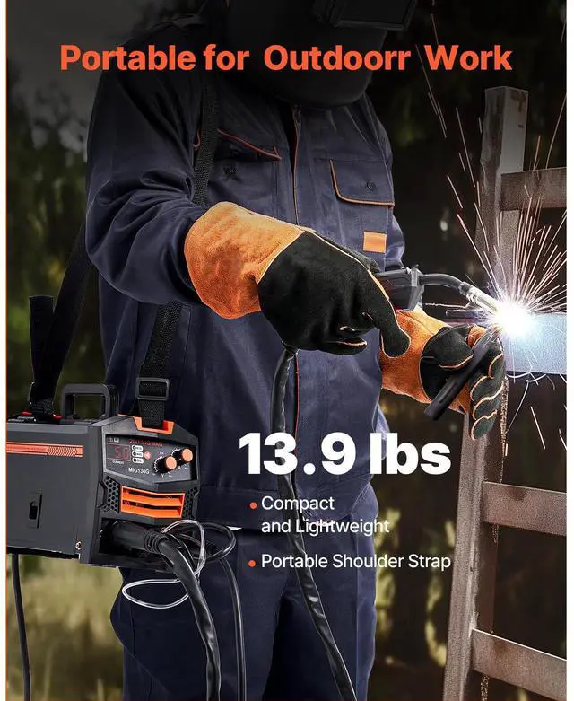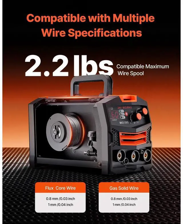 Welding Thickness: 0.31 inch ( 8 mm),Compatible Wire Type: Flux Core Wire / Gas Solid Wire,Compatible Maximum Wire Spool: 2.2 lbs / 1 kg,Output Current: 130A,Item Model Number: MIG130G,Product Weight: 13.9 lbs / 6.3 kg (Include All Accessories),Functions: Gasless MIG, Gas MIG,Product Dimensions: 13 x 6.3 x 9.1 inch / 330 x 160 x 230 mm,Input Capacity: 4.5 KVA,Compatible Wire Diameter: 0.03 inch / 0.8 mm, 0.04 inch / 1 mm