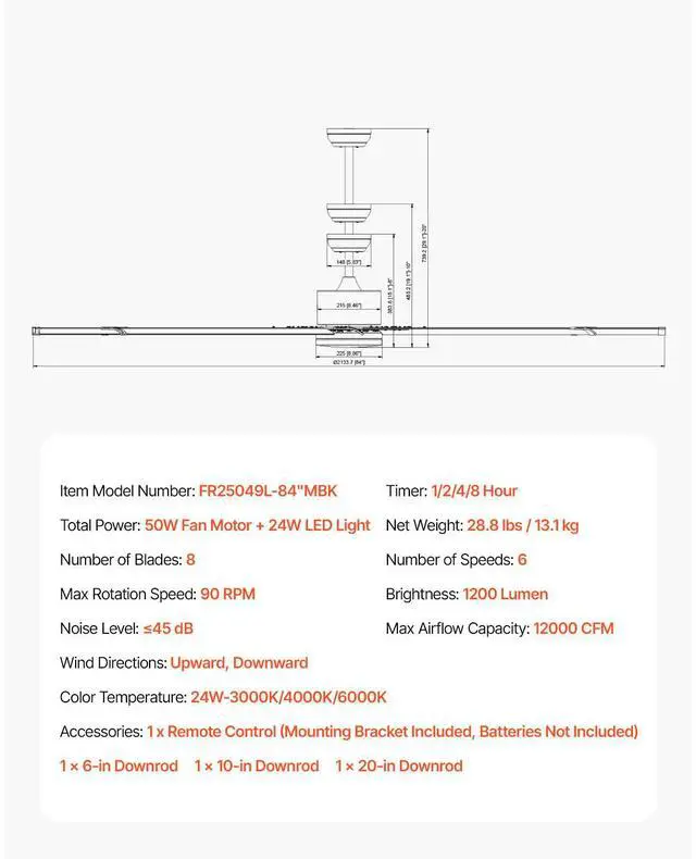 20-in Downrod: 84.25 x 29.1/2140 x 739.2 mm,Color Temperature: 24W-3000K/4000K/6000K,Brightness: 1200 Lumen,Color: Black,Max Airflow Capacity: 12000 CFM,6-in Downrod: 84.25 x 15.1"/2140 x 383.6 mm,Product Dimensions:,Number of Speeds: 6,10-in Downrod: 84.25 x 19.1"/2140 x 485.2 mm,Wind Directions: Upward, Downward,Noise Level: 45 dB,Timer: 1/2/4/8 Hour,Max Rotation Speed: 90 RPM,Item Model Number: FR25049L-84"MBK,Number of Blades: 8,Net Weight: 28.8 lbs / 13.1 kg,Power: 78 W