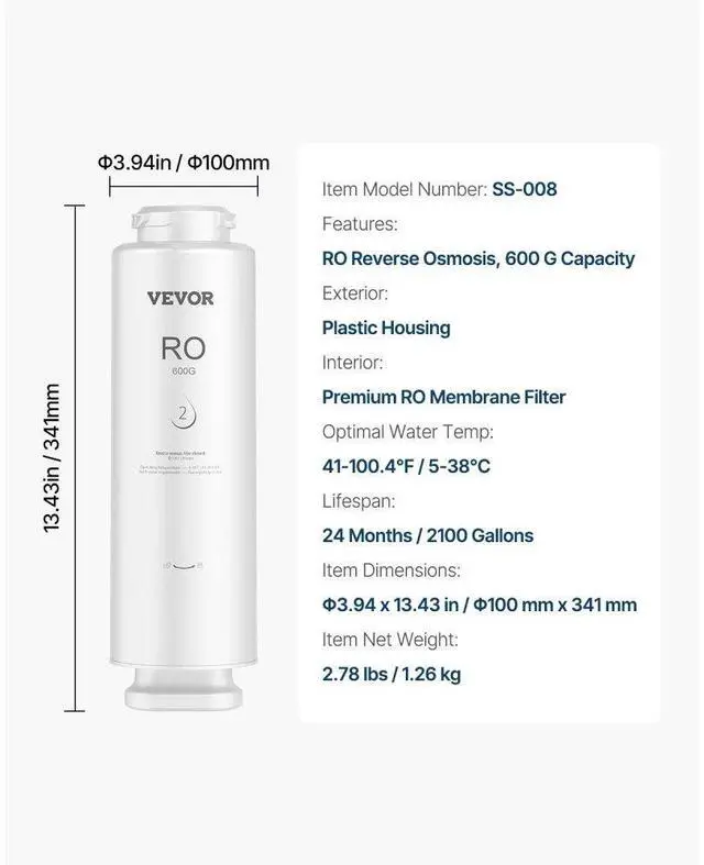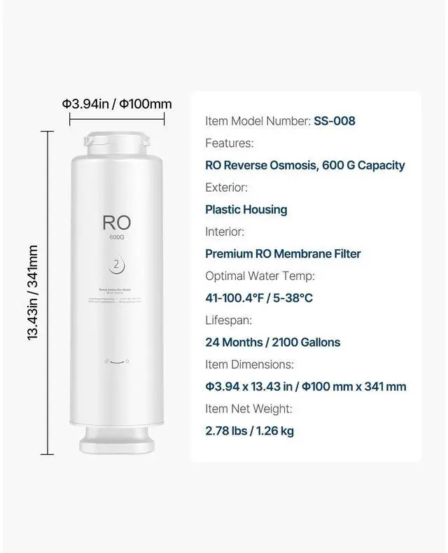 Optimal Water Temp: 41-100.4°F / 5-38°C,Item Model Number: SS-008,Features: RO Reverse Osmosis, 600 G Capacity,Interior: Premium RO Membrane Filter,Item Dimensions: 3.94 x 13.43 in / 100 x 341 mm,Item Net Weight: 2.78 lbs / 1.26 kg,Exterior: Plastic Housing,Lifespan: 24 Months or 8 Tons of Water