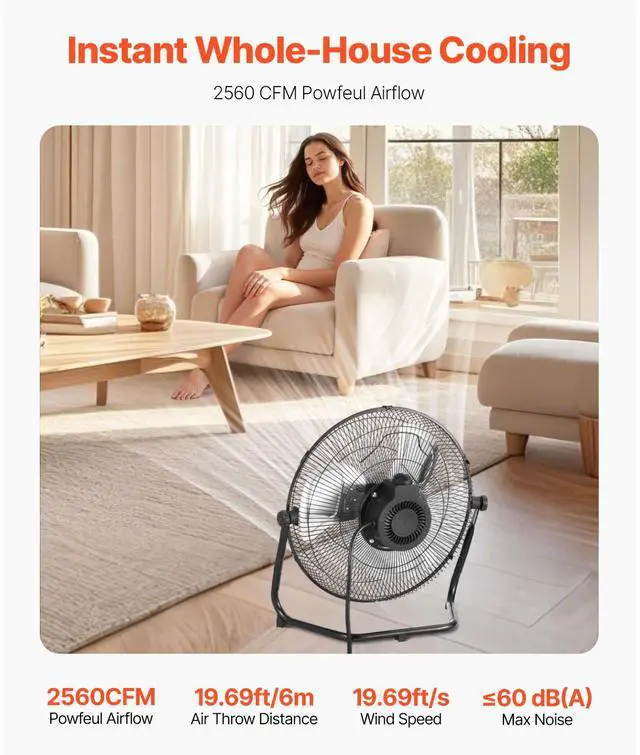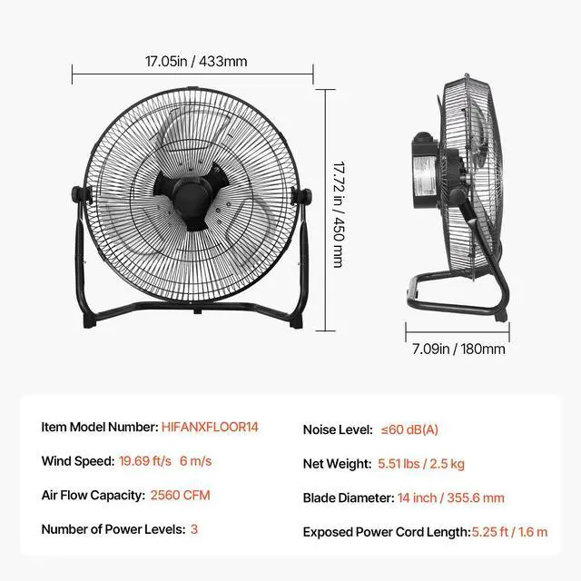 Noise Level: 60 dB(A),Blade Diameter: 14 inch / 355.6 mm,Number of Power Levels: 3,Air Flow Capacity: 2560 CFM,Wind Speed: 19.69 ft/s (6 m/s),Item Model Number: HIFANXFLOOR14,Exposed Power Cord Length: 5.25 ft / 1.6 m,Product Dimensions: 17.05 x 7.09 x 17.72 inch / 433 x 180 x 450 mm,Net Weight: 5.51 Ibs / 2.5 kg