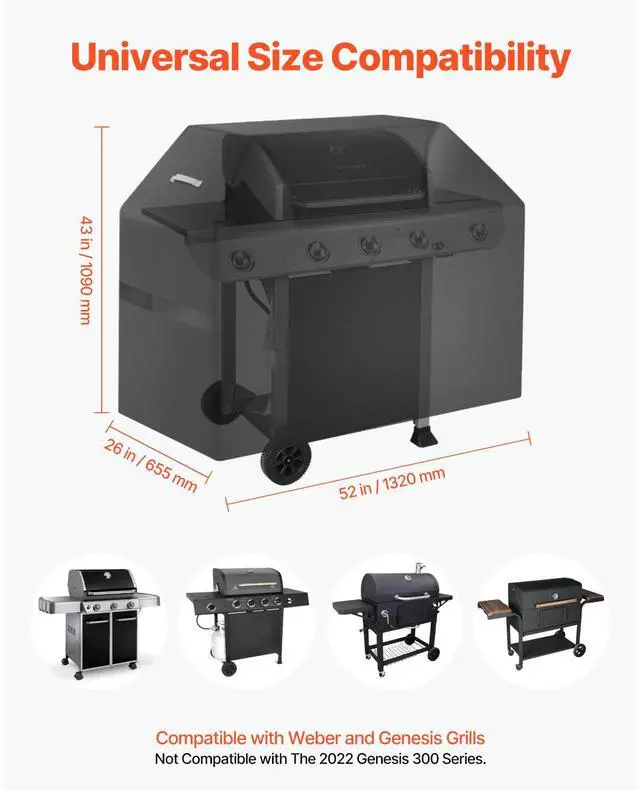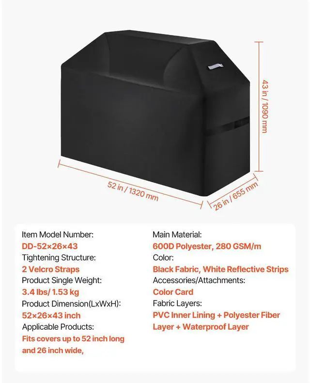 Tightening Structure: 2 Velcro Straps,Applicable Products: Fits covers up to 52 inch long and 26 inch wide, compatible with Weber, Genesis, Charbroil, and other gas grills.,Color: Black Fabric, White Reflective Strips,Item Model Number: DD-52x26x43,Product Single Weight: 3.4 lbs/ 1.53 kg,Fabric Layers: PVC Inner Lining + Polyester Fiber Layer + Waterproof Layer,Main Material: 600D Polyester, 280 GSM/m
