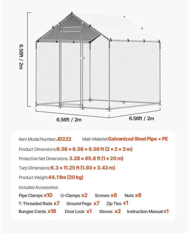 Tarp Dimensions: 6.3 x 11.25 ft (1.93 x 3.43 m),Protective Net Dimensions: 3.28 x 65.6 ft (1 x 20 m),Item Model Number: JD222,Product Weight: 44.1 lbs (20 kg),Product Dimensions: 6.56 x 6.56 x 6.56 ft (2 x 2 x 2 m),Main Material: Galvanized Steel Pipes + PE