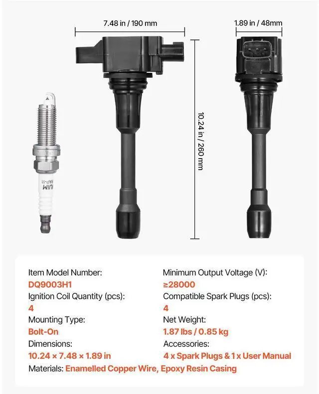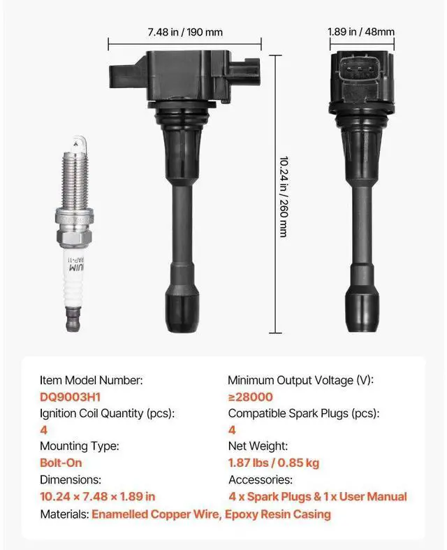 Minimum Output Voltage (V): 28000,Ignition Coil Quantity (pcs): 4,Materials: Enamelled Copper Wire, Epoxy Resin Casing,Item Model Number: DQ9003H1,Compatible Spark Plugs (pcs): 4,Dimensions: 10.24" x 7.48" x 1.89" / 260 x 190 x 48 mm,Mounting Type: Bolt-On,Net Weight: 1.87 lbs / 0.85 kg