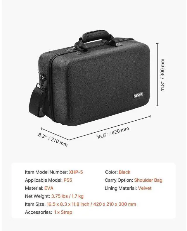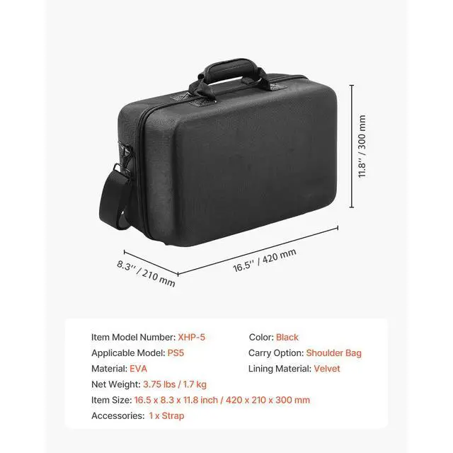 Carry Option: Shoulder Bag,Applicable Model: PS5,Item Size: 16.5 x 8.3 x 11.8 inch / 420 x 210 x 300 mm,Color: Black,Lining Material: Velvet,Item Model Number: XHP-5,Material: EVA,Net Weight: 3.75 lbs / 1.7 kg