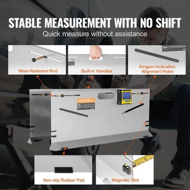 VEVOR Wheel Alignment Tool, 2-Pack Toe Plates, Camber/Caster/Toe Gauge 0.1 ° Accuracy, Stainless Steel Tool Plate, Magnetic Slots and 6 Alignment Rods, Includes 2 Measuring Tapes & Conversion Chart Universal Compatibility High-Precision Toe Plates 0.1 ° Digital Camber Gauge Stainless Steel Construction Easy Solo Operation Convenient Portability and