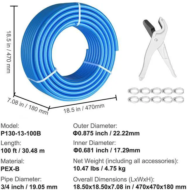 VEVOR PEX Pipe 3/4 Inch, 100 Feet Length PEX-B Flexible Pipe Tubing for Potable Water, Pex Water Lines for Hot/Cold Water & Easily Restore, Plumbing Applications with Free Cutter & Clamps, Blue PEX-A Pipe vs. PEX-A Pipe Smooth and Rust-Free 4-Step Quick Installation Versatile PEX-B Pipe Smooth Inner Surface Longevity PEX-A pipe offers excellent heat stability and pressure resistance, reducing the likelihood of ruptures and damage. With a lifespan of up to 5 years or more, it eliminates the need for frequent replacements, providing both cost-effectiveness and peace of mind.