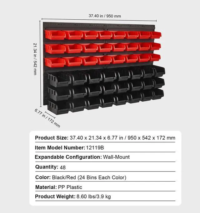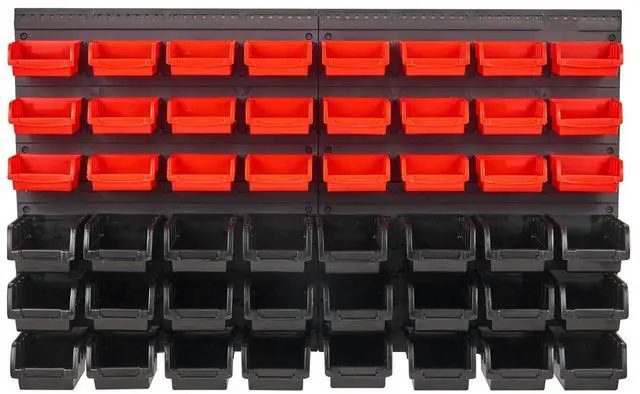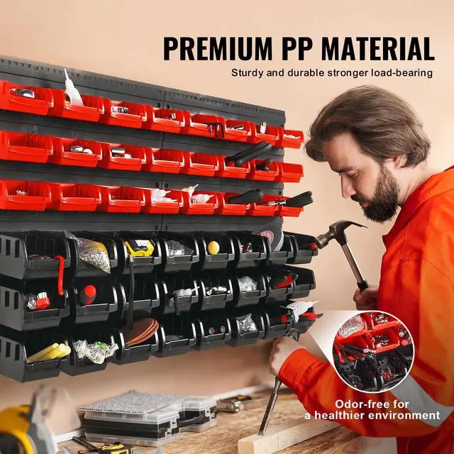 VEVOR Wall Mounted Storage Bins, 48-Bin Parts Rack Organizer Garage Plastic Shop Tool with Wall Panels, Tool Organizer for Nuts, Bolts, Screws, Nails, Beads, Buttons, Other Small Parts, Black and Red Ample Storage Space Sturdy PP Material Two Usage Modes Abundant Accessories Versatile Applications Customized Experience Expandable Configuration: Wall-Mount, Color: Black/Red, Item