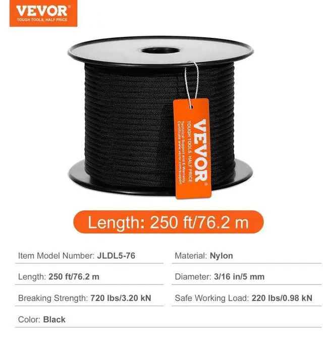 Item Model Number: JLDL5-76 Material: Nylon Length: 250 ft/ 76.2 m Diameter: 3/16 in/5 mm Breaking Strength: 720 lbs/ 3.20 kN Safe Working Load: 220 lbs/ 0.98 kN Color: Black