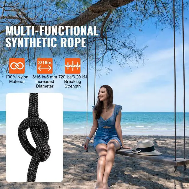 VEVOR Braided Nylon Cord, 3/16 inch by 250 feet, 32-Strand Design, 720 LBS Tensile Strength, Multi-Purpose Black Rope for Outdoor, Tree Work, Hiking, Swinging, and Rescue Operations