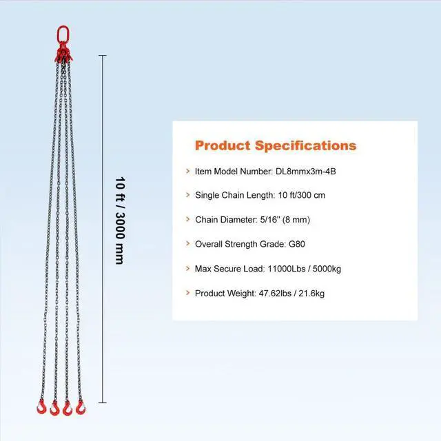 VEVOR 5/16" x 10' Chain Sling 4 Legs G80 Lifting Chain with Grab Hooks 11000 lbs G80 Chain Critical Coating Adjustable Hook Wide Applications Designed with You in Mind Secure Hook Design Single Chain Length: 10 ft/300 cm, Item
