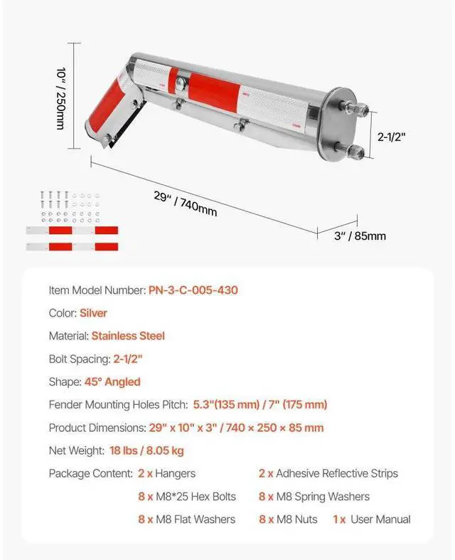 Stainless Steel Angled Spring Loaded Mud Flap Hangers for Semi Trucks 2-1/2" Precise Bolt Spacing Durable Construction Enhanced Shock Absorption High-Visibility Reflective Strips Easy Installation Widely Compatible Fender