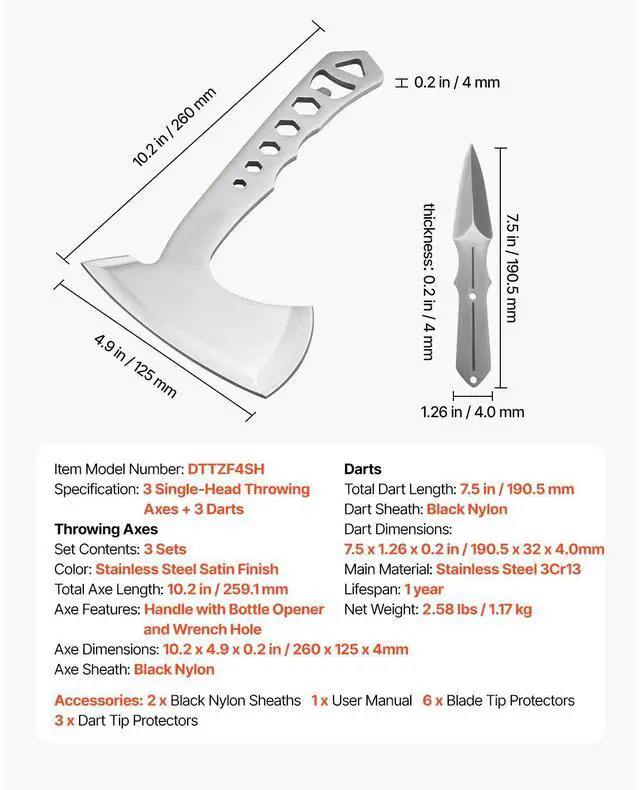 Throwing Axes and Tomahawks 3 Pack Hatchet Axes and 3 Pack Knives Throwing Set Rugged Stainless Steel Build More Than an Axe Secure Nylon Sheath Protection Gift-Ready Packaging Versatile for Any Setting Optimized for Precision & Durability Total Axe Length: 10.2 in / 259.1 mm, Total