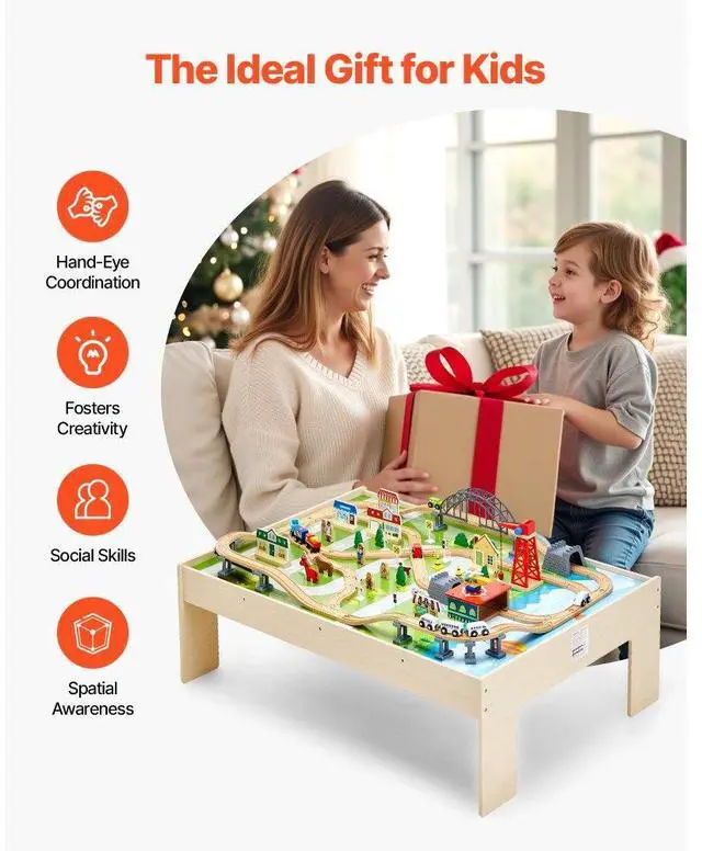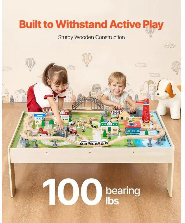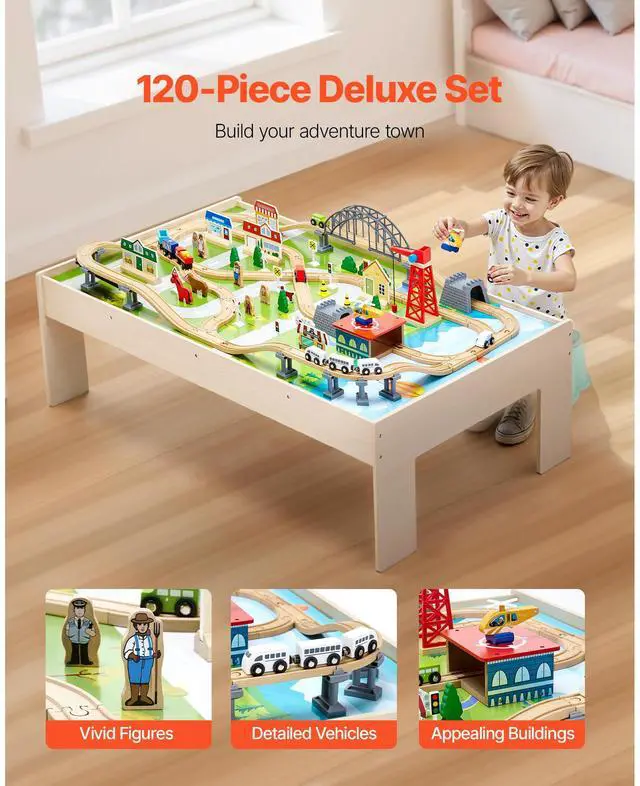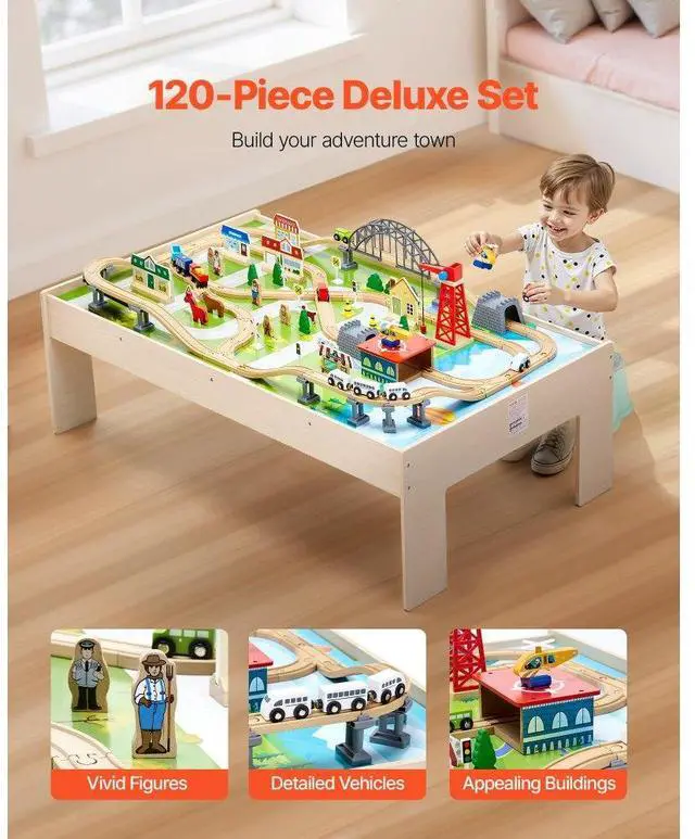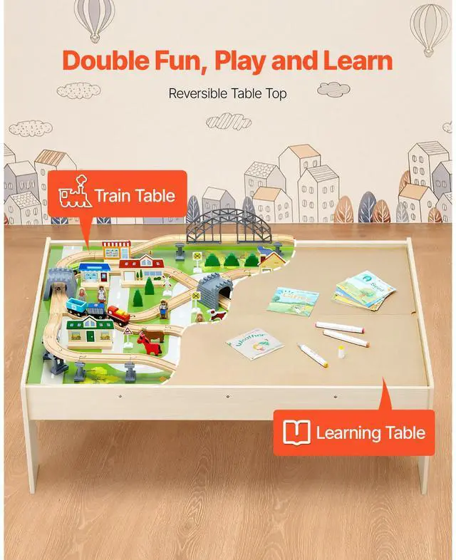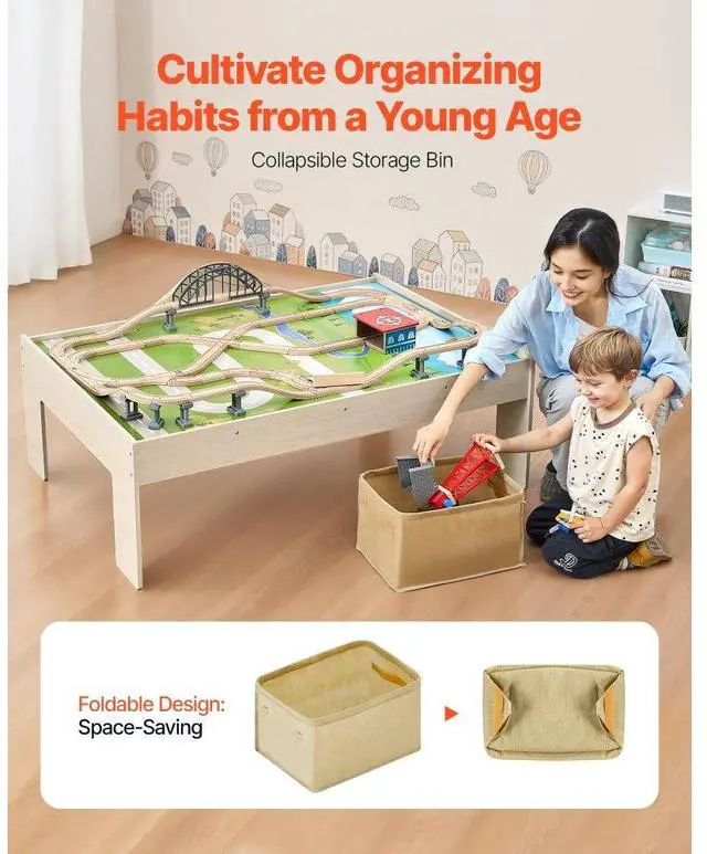 Train Table 120 Pieces Wooden Kids Activity Table with Collapsible Storage Bin Town Theme Set 3-in-1 Multifunctional Table Interactive Play Thoughtful Design Ideal Gift Comprehensive Installation Guide Set