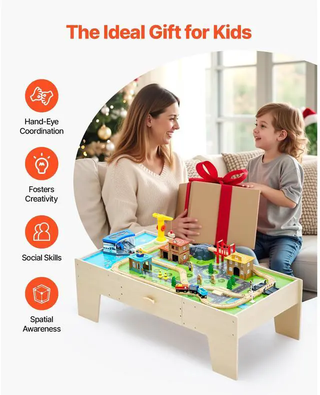 Train Table 62 Pieces Wooden Kids Activity Table with Large Storage Drawer Town Theme Set 3-in-1 Multifunctional Table Interactive Play Thoughtful Design Ideal Gift Comprehensive Installation Guide Set