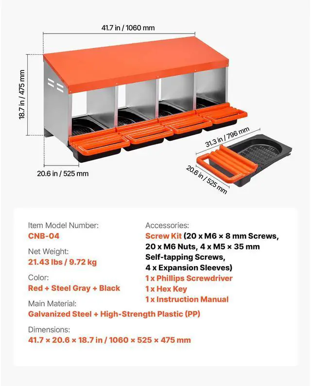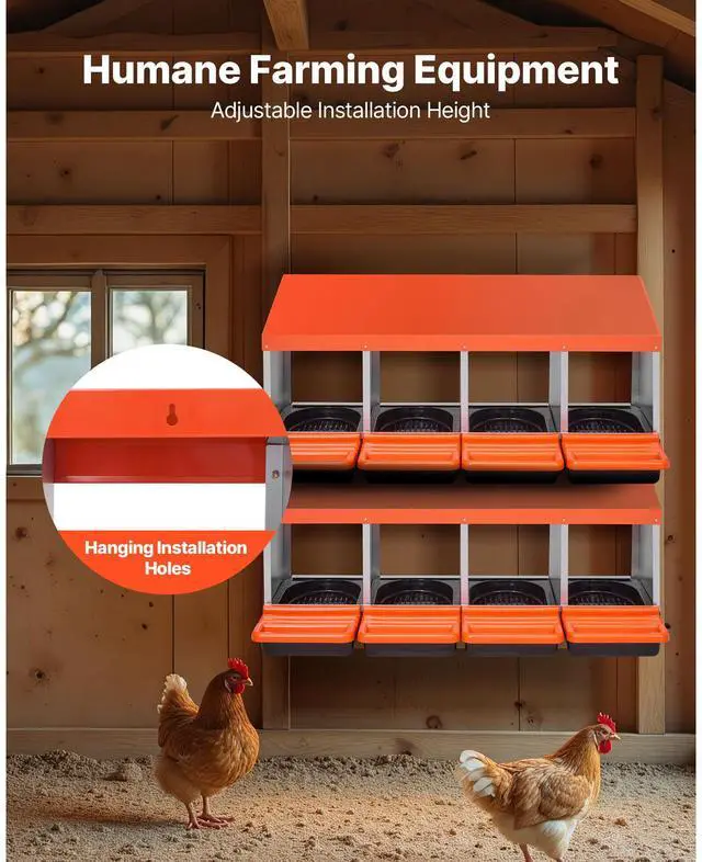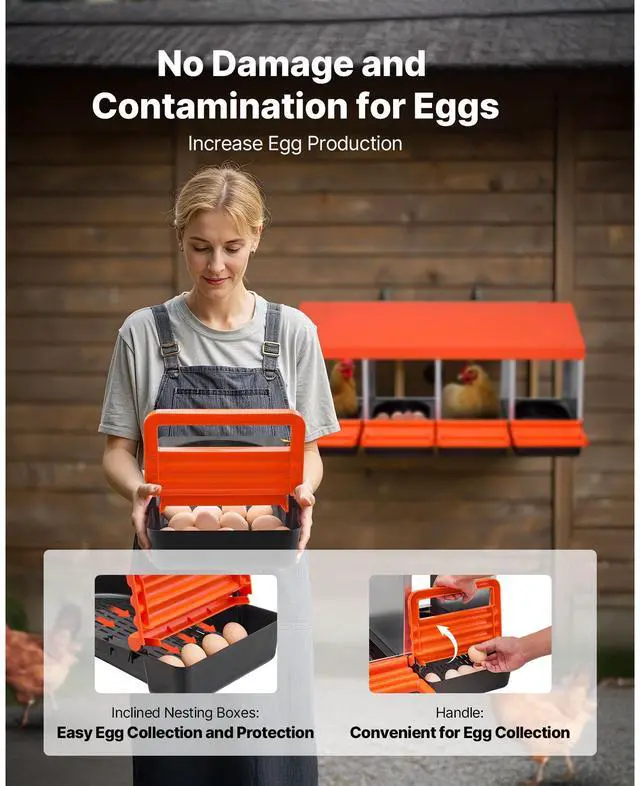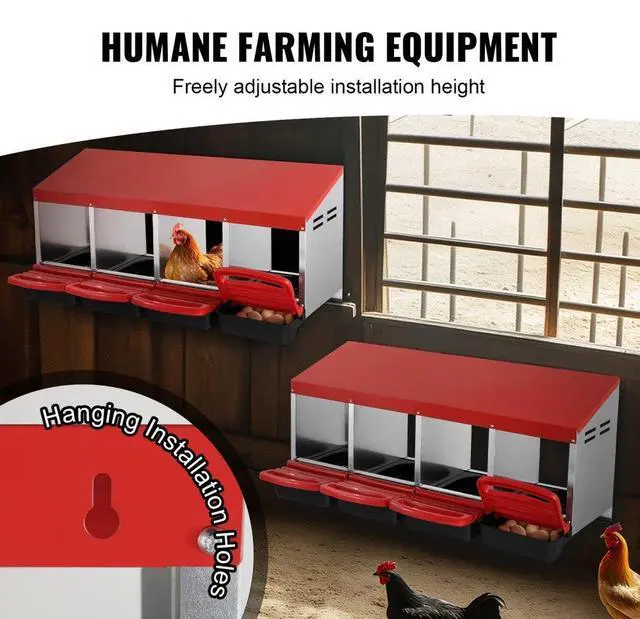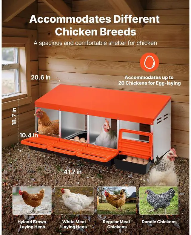 VEVOR 4-Compartment Chicken Nest Box Mental Box with Inclined Nesting Boxes Ample Space & Fit for Different Chickens Premium Materials, Sturdy & Durable Automatic Egg Collection & Safeguard Quick and Easy to Install Full of Abundant Accessories Easy to