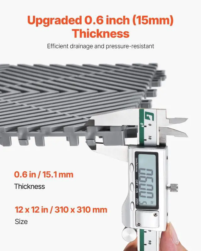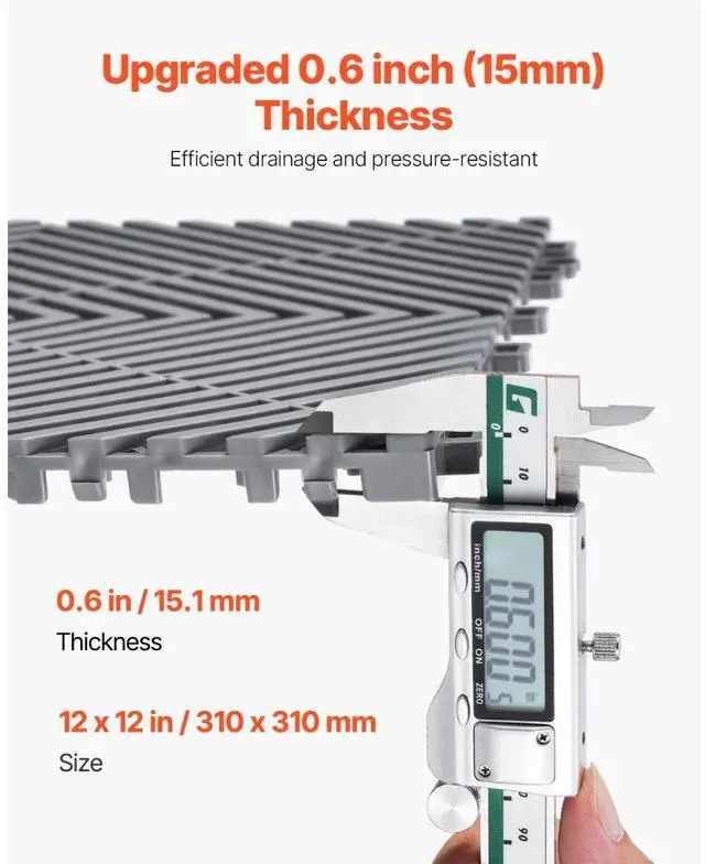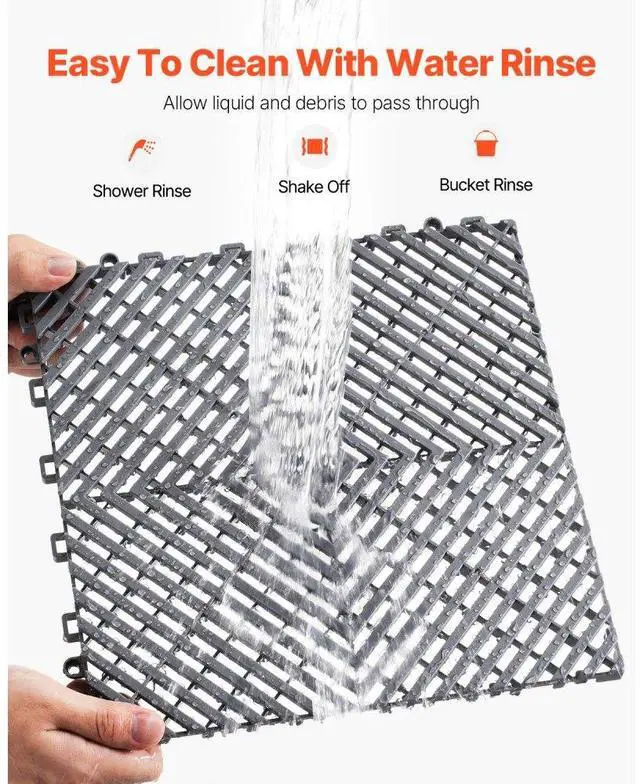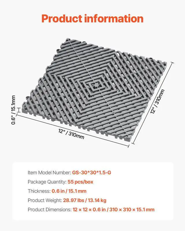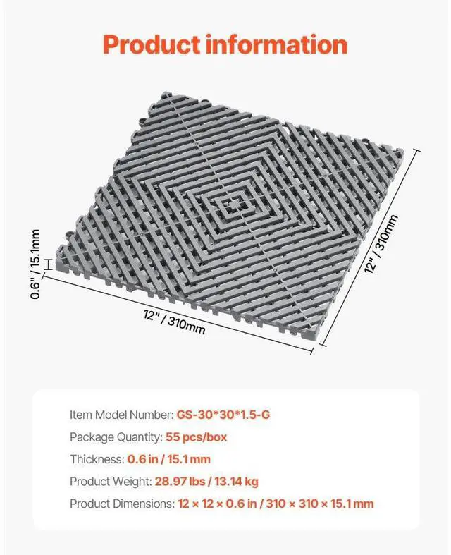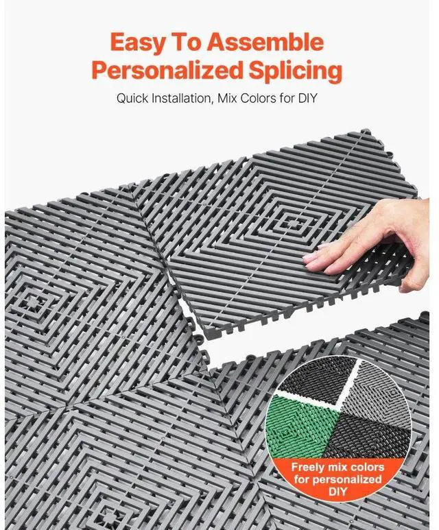 VEVOR Interlocking Drainage Mat, 12 x 12 Modular Interlocking Cushion Durable PP Material, 55 Pcs Splicing Drainage Mats, Non-Slip Drainage Floor Tile and Shower Mat, for Garage, Garden, Kitchen & Outdoor, Grey Tough PP Material Extra Thickness for Reliability Snap-Together Setup Slip-Resistant Surface Versatile for Any Space Built to