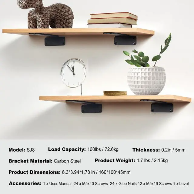 Thickness: 0.2in / 5mm,Load Capacity: 160lbs / 72.6kg,Model: SJ8,Product Weight: 4.7 lbs / 2.15kg,Product Dimensions: 6.3 x 3.94 x 1.78 in / 160 x 100 x 45mm,Bracket Material: Carbon Steel