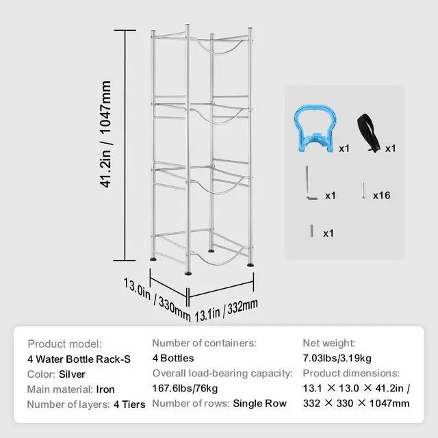 Primary Material: Iron,Number of Rows: Single Row,Capacity: 4 Bottles,Number of Tiers: 4 Tiers,Color: Silver,Product Model: 4 Water Bottle Rack-S,Product Dimensions: 13.1 × 13.0 × 41.2 in / 332 × 330 × 1047 mm,Net Weight: 6.66 lbs / 3.02 kg,Overall Load Capacity: 167.6 lbs / 76 kg