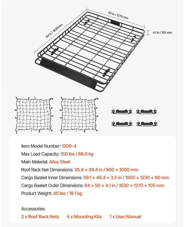 Cargo Basket Outer Dimensions: 64 x 50 x 4.1 in / 1630 x 1270 x 105 mm