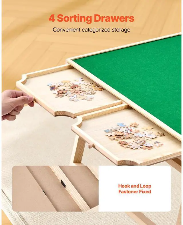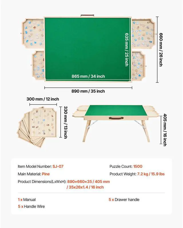Number of Drawers: 4,Puzzle Count: 1500,Puzzle Area Size: 34x25 inch / 865x635 mm,Product Dimension: 35x26x2.4/16 inch / 890x660x60/405 mm,Item Model Number: SJ-07,Product Weight: 15.9 lbs / 7.2 kg,Main Material: Pine