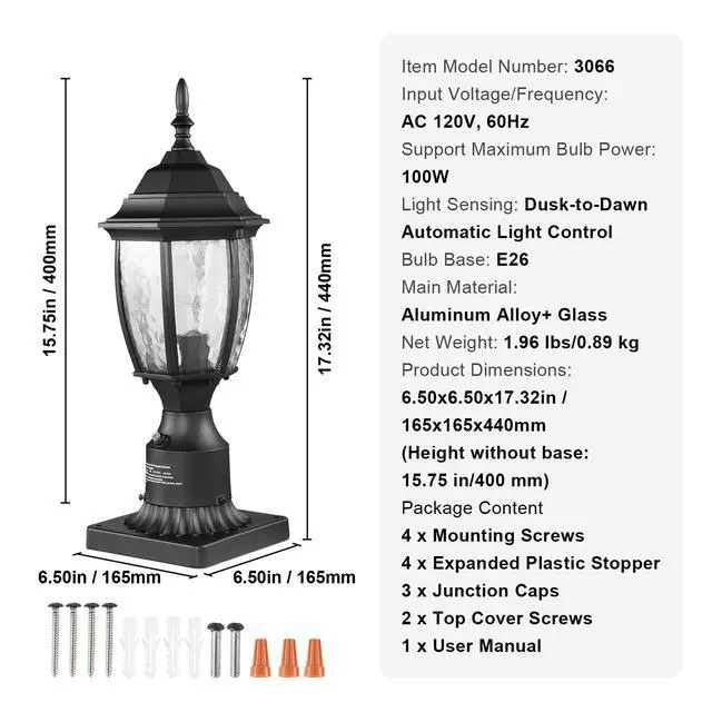 Bulb Base: E26,Support Maximum Bulb Power: 100W,Light Sensing: Dusk-to-Dawn Automatic Light Control,Item Model Number: 3066,Product Dimensions: 6.50 x 6.50 x 17.32 in/165 x 165 x 440 mm (Height without base: 15.75 in/400 mm),Input Voltage/Frequency: AC 120V, 60Hz,Net Weight: 1.96 lbs/0.89 kg,Main Material: Aluminum Alloy+ Glass