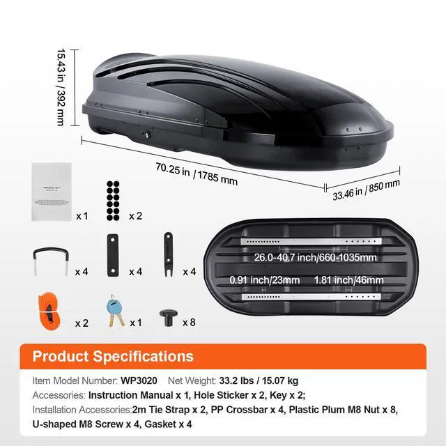Max Weight Capacity: 165 lbs / 75 kg,Item Model Number: WP3020,Storage Capacity: 11 cu.ft / 340 L,Net Weight: 33.2 lbs / 15.07 kg,Main Material: ABS,Product Size: 70.25 x 33.46 x 15.43 inch / 1785 x 850 x 392 mm