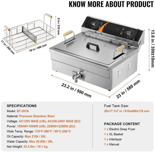 Oil Capacity: Max 21Qt / 20L,Water Capacity: Max 30.6Qt / 29L,Voltage: AC120V 60HZ,Item Model Number: EF-201S,Material: Premium Stainless Steel,Wide Temp. Range: 175°F-390°F / 80°C-200°C,Net Weight: 33.3 lbs / 15.1 kg,Power: 1500W+1500W