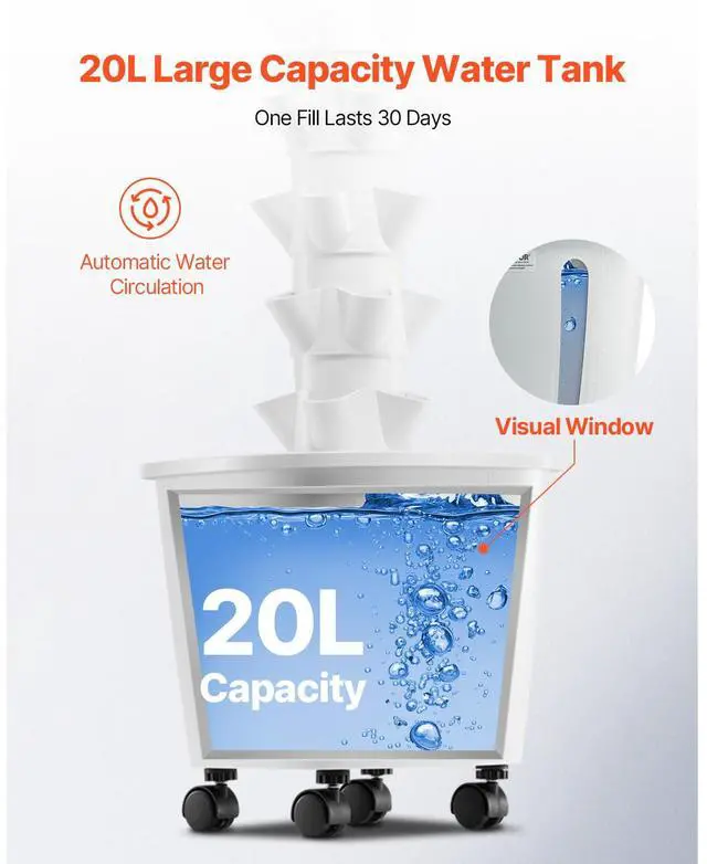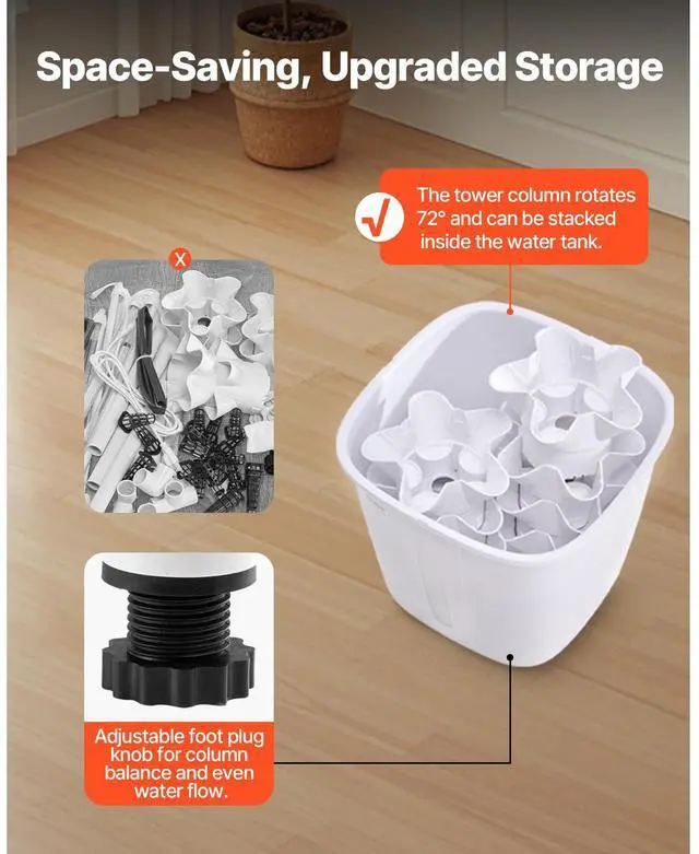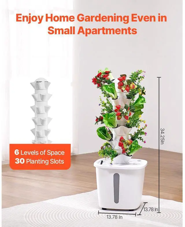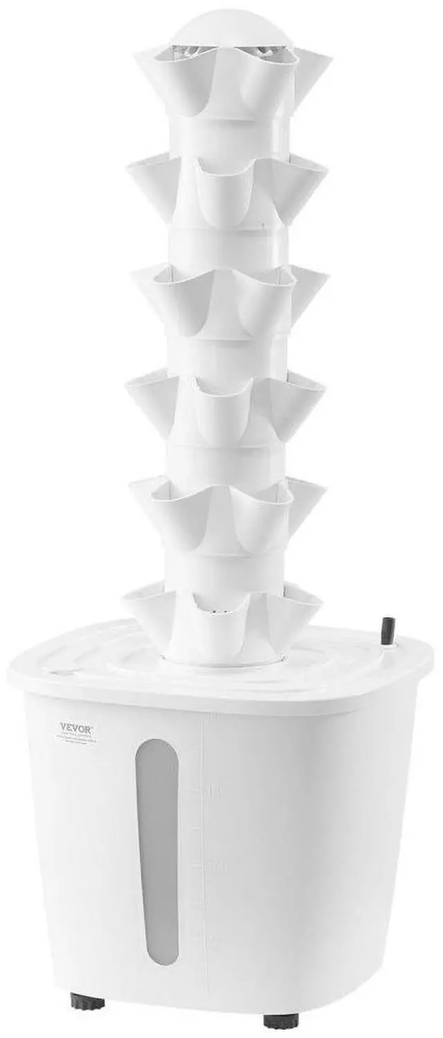 Number of Layers: 6,Main Materials: ABS, PP,Includes Grow Light: No,Water Tank Capacity: 20L,Wheels: No,Color: White,Item Model Number: VV1-6C-US,Product Weight: 7.5 lbs / 3.4 kg,Dimensions: 13.78 x 13.78 x 34.25 in / 350 x 350 x 870 mm,Number of Planting Slots: 30