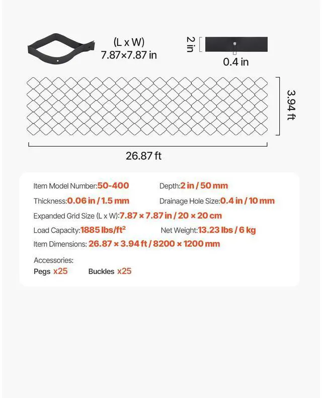 Thickness: 0.06 in / 1.5 mm,Load Capacity: 1885 lbs/ft²,Expanded Grid Size (L x W): 7.87 x 7.87 in / 20 x 20 cm,Item Model Number: 50-400,Item Dimensions: 26.87 x 3.94 ft / 8200 x 1200 mm,Drainage Hole Size: 0.4 in / 10 mm,Net Weight: 13.23 lbs / 6 kg,Depth: 2 in / 50 mm