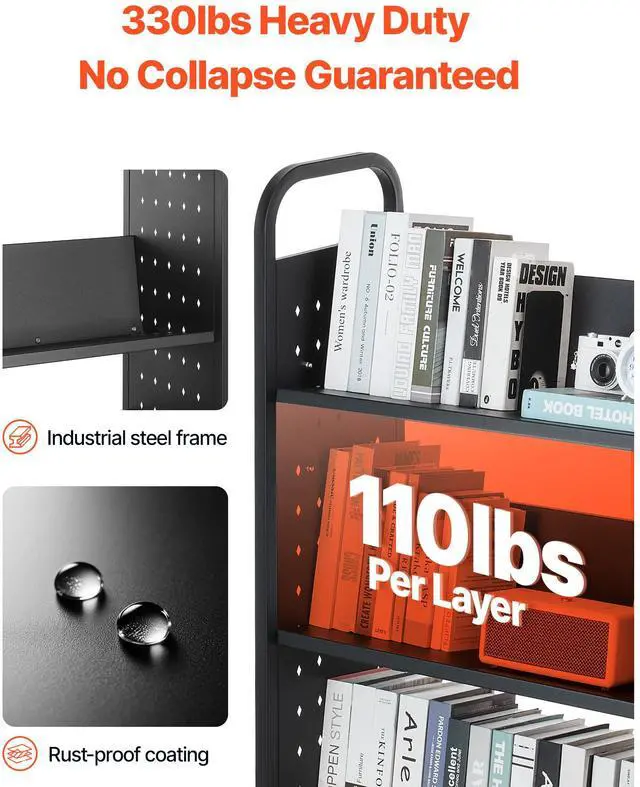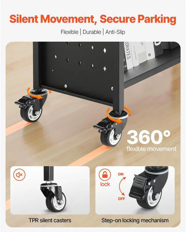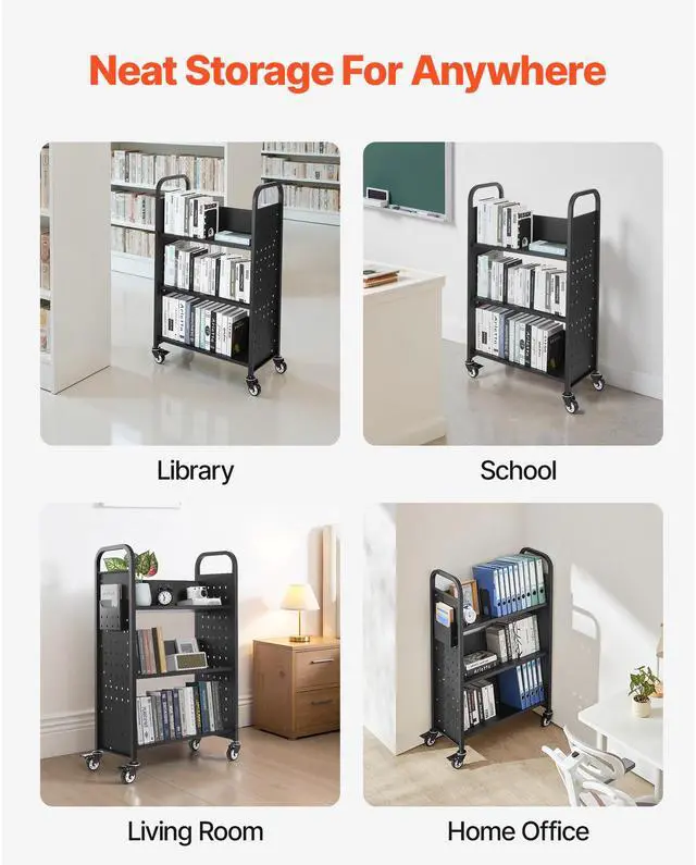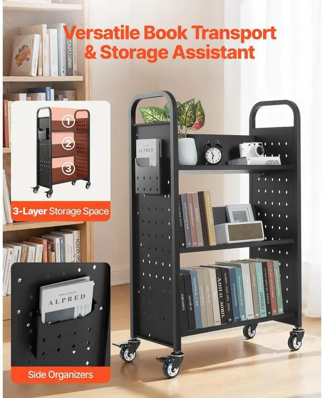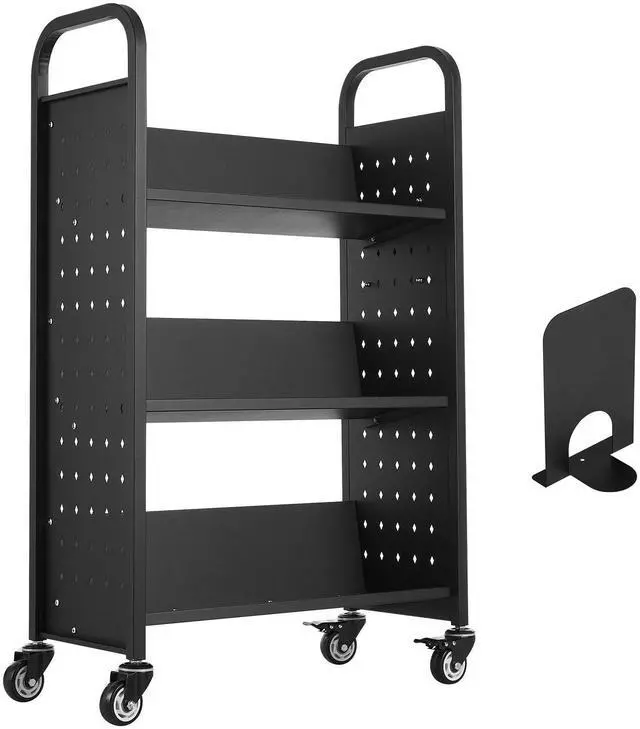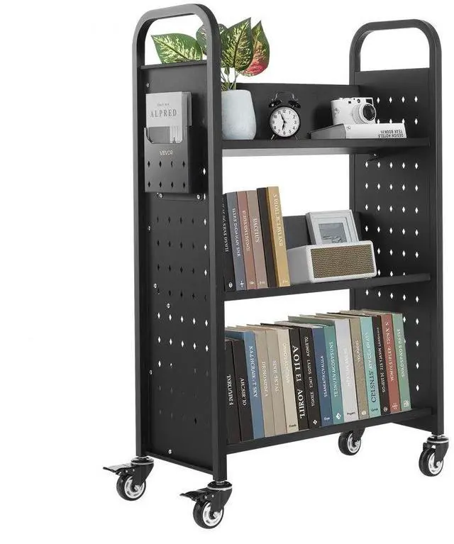 VEVOR 3-Tier Rolling Book Cart Single Sided V-Shaped Shelves Book Truck in Black