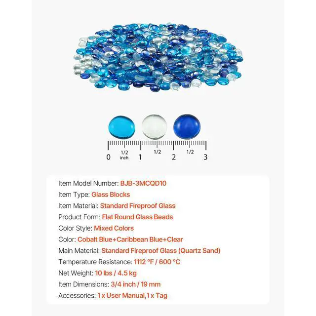 Product Form: Flat Round Glass Beads,Item Material: Standard Fireproof Glass,Color: Cobalt Blue + Sea Blue + Transparent,Item Model Number: BJB-3MCQD10,Temperature Resistance: 1112 / 600 ,Color Style: Mixed Colors,Item Dimensions: 3/4 inch / 19.05 mm,Item Type: Glass Beads,Net Weight: 10 lbs / 4.5 kg,Main Material: Standard Fireproof Glass (Quartz Sand)