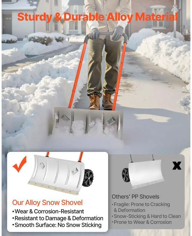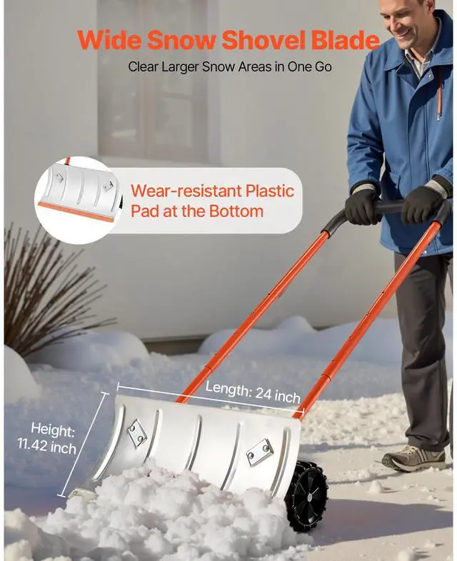 Winter Snow Pusher Shovel with Wheels 24 in Durable Metal Snow Plow for Driveway
