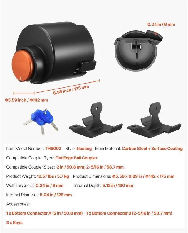 Compatible Coupler Type: Flat Edge Ball Coupler,Compatible Coupler Sizes: 2 in / 50.6 mm; 2-5/16 in / 58.6 mm,Item Model Number: THS002,Product Weight: 12.57 lbs / 5.7 kg,Style: Nesting,Wall Thickness: 0.24 in / 6 mm,Product Dimensions: 5.59 x 6.89 in / 142 x 175 mm,Internal Depth: 5.12 in / 130 mm,Internal Diameter: 5.04 in / 128 mm,Main Material: Carbon Steel + Surface Coating