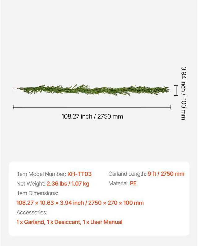 Item Model Number: XH-TT03,Garland Length: 9 ft / 2750 mm,Material: PE,Item Dimensions: 108.27 x 10.63 x 3.94 inch / 2750 x 270 x 100 mm,Net Weight: 2.36 lbs / 1.07 kg