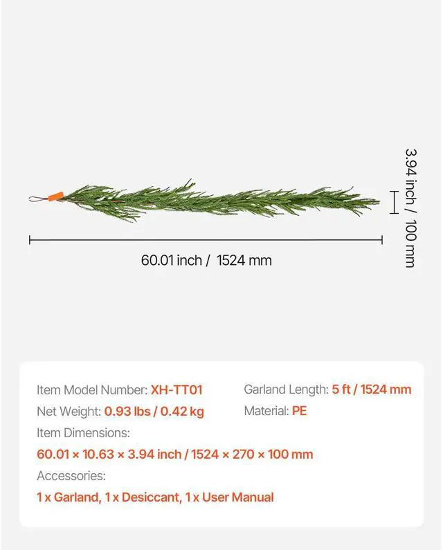 Item Model Number: XH-TT01,Garland Length: 5 ft / 1524 mm,Material: PE,Item Dimensions: 60.01 x 10.63 x 3.94 inch / 1524 x 270 x 100 mm,Net Weight: 0.93 lbs / 0.42 kg