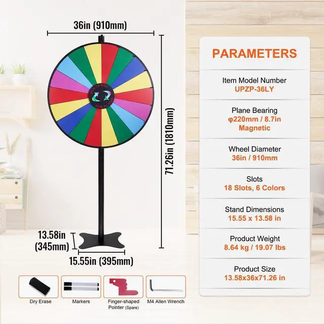 Slots: 18 Slots, 6 Colors,Item Model Number: UPZP-36LY,Product Weight: 8.64 kg/19.07 lbs,Plane Bearing: 220 mm/8.7 inch, Magnetic,Wheel Diameter: 36 inch/910 mm,Stand Dimensions: 395x345mm/15.55x18 inch,Product Size: 910x345x1810 mm/35.83x18x71.26 inch