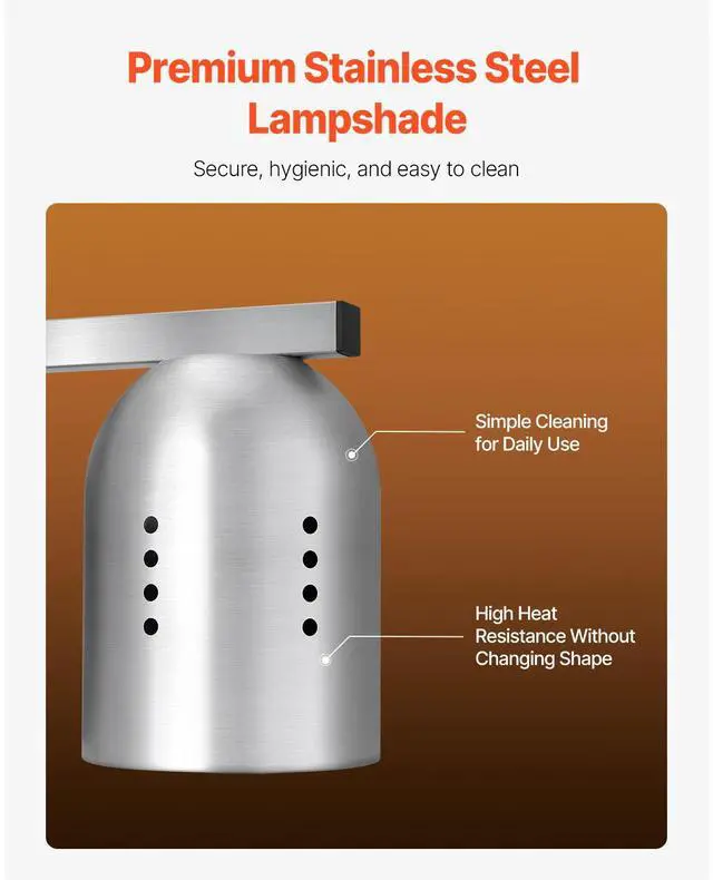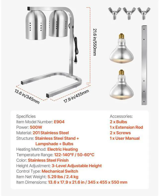 Height Adjustment: 3-level Adjustable Height,Control Type: Mechanical Switch,Color: Stainless Steel Finish,Item Model Number: E904,Material: 201 Stainless Steel,Heating Method: Electric Heating,Item Net Weight: 5.29 lbs / 2.4 kg,Item Dimensions: 13.6 x 17.9 x 21.6 in / 345 x 455 x 550 mm,Structure: Stainless Steel Stand + Lampshade + Bulbs,Power: 500W