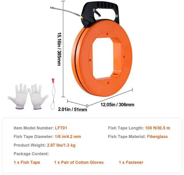 Item Model Number: LFT01,Product Weight: 2.87 lbs/1.4 kg,Fish Tape Diameter: 1/16 in / 1.58 mm,Fish Tape Material: Fiberglass,Fish Tape Length: 100 ft/30.5 m