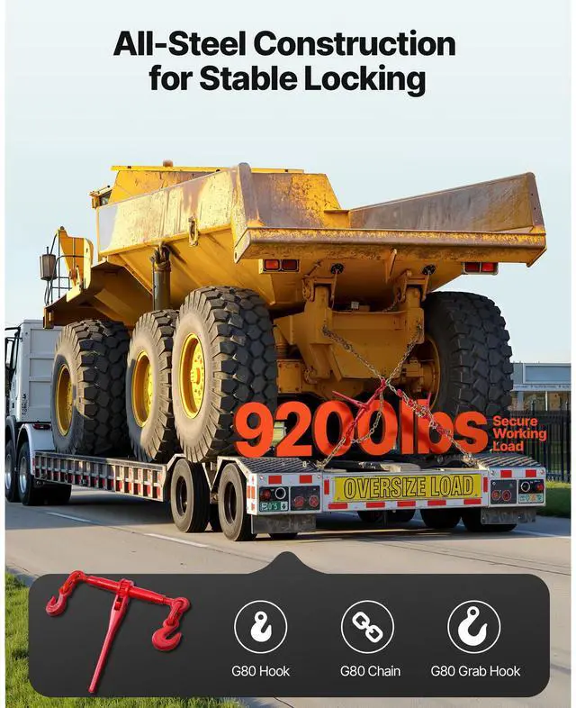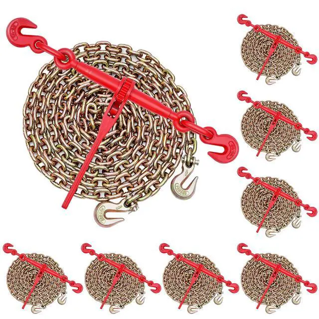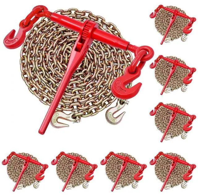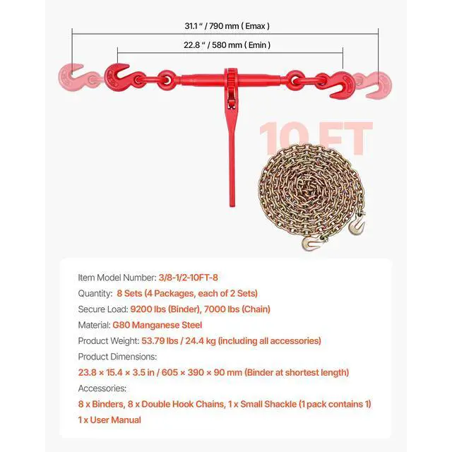 Item Model Number: 3/8-1/2-10FT-8,Secure Load: 9200 lbs (Binder), 7000 lbs (Chain),Product Weight: 53.79 lbs / 24.4 kg (including all accessories),Quantity: 8 Sets (4 Packages, each of 2 Sets),Material: G80 Manganese Steel,Product Dimensions: 23.8 x 15.4 x 3.5 in / 605 x 390 x 90 mm (Binder at shortest length)