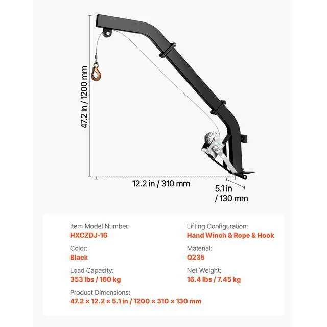 Load Capacity: 353 lbs / 160 kg,Color: Black,Item Model Number: HXCZDJ-16,Lifting Configuration: Hand Winch & Rope & Hook,Material: Q235,Product Dimensions: 47.2 x 12.2 x 5.1 in / 1200 x 310 x 130 mm,Net Weight: 16.4 lbs / 7.45 kg