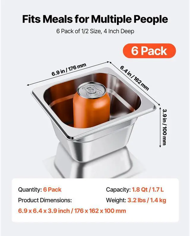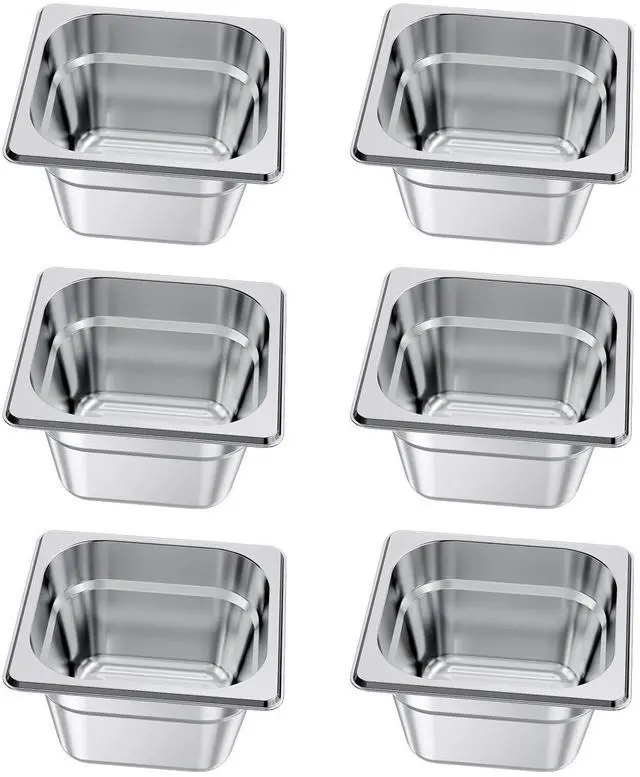 Thickness: 0.02 inch / 0.53 mm,Type: 1/6 Size Pan,Capacity: 6.8 Qt / 1.7 L,Item Model Number: HZ816-100T,Quantity: 6 Pack,Net Weight: 3.2 lbs / 1.4 kg,Product Size: 6.9 x 6.4 x 3.9 inch / 176 x 162 x 100 mm