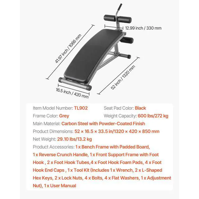 Seat Pad Color: Black,Frame Color: Grey,Weight Capacity: 600 lbs/272 kg,Pad Dimensions: 41.97 x 12.99 in/1066 x 330 mm,Product Dimensions: 52 x 16.5 x 33.5 in/1320 x 420 x 850 mm,Net Weight: 29.10 lbs/13.2 kg,Item Model NmuberTL902:,Main Material: Carbon Steel with Powder-Coated Finish